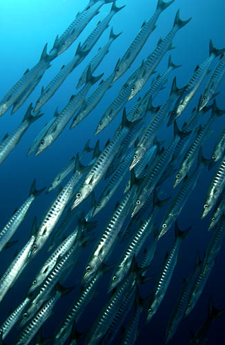 Chapman’s Reef is among the best known dive sites in the Kavieng area, renowned for its large schools of pelagic fish, including sharks. Here, I rolled back off of the inflatable, grabbed my camera from the tender, and immediately descended into a large school of barracuda. I swam into the school as they parted and then swirled around before diving into the deep water below. Chapman’s Reef lived up to its hype.