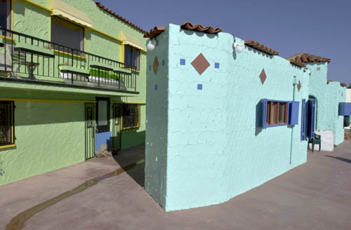 | Close to the nice not so touristy pier we found the "Venetian Courts". This is a place we like to photograph. Although it has nothing really in common with Venice, Italy it is kind of the "Burano" of the Pacific and the original Burano is an island near Venice. Even if the some of the colors are off if you would see it by itself the whole setting is very unique and beautiful. |