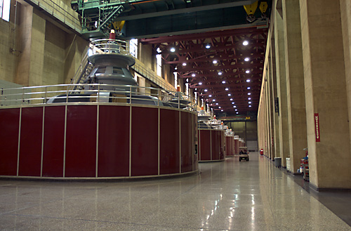 | And "below" is the word. We're right beneath the generators and above the turbines which drive them. All that spinning machinery made ear plugs a neccessity (included with the tour along with plastic hard hats, which you get to keep). |