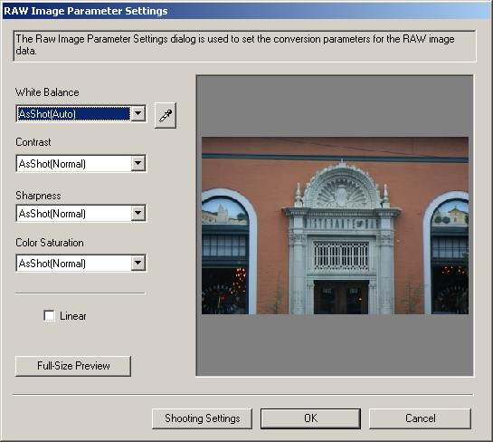There we select "My Computer" and navigate into the CRW file folder and all CRW files are displayed with their thumbnails. The we chose "Set Raw Params" and the following dialog will be displayed. |