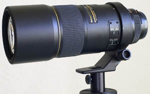 | From my tests so far, the lens does a really good job at f/4, losing little definition. I have no qualms about shooting the lens wide open, which really helps to keep the shutter speed up. As with any long focal length lens, it is necessary to use a fairly high shutter speed when hand-holding to avoid an unsharp image, or use a support device. When waiting for that perfect moment to arrive, the use of a monopod or tripod is almost a necessity to avoid fatigue as the lens and a D1 weighs nearly six pounds. On a bright day in direct sunlight it is easily possible to hand-hold the lens though. The body of this lens is a little larger in diameter than the 300 f/4 EDIF. |